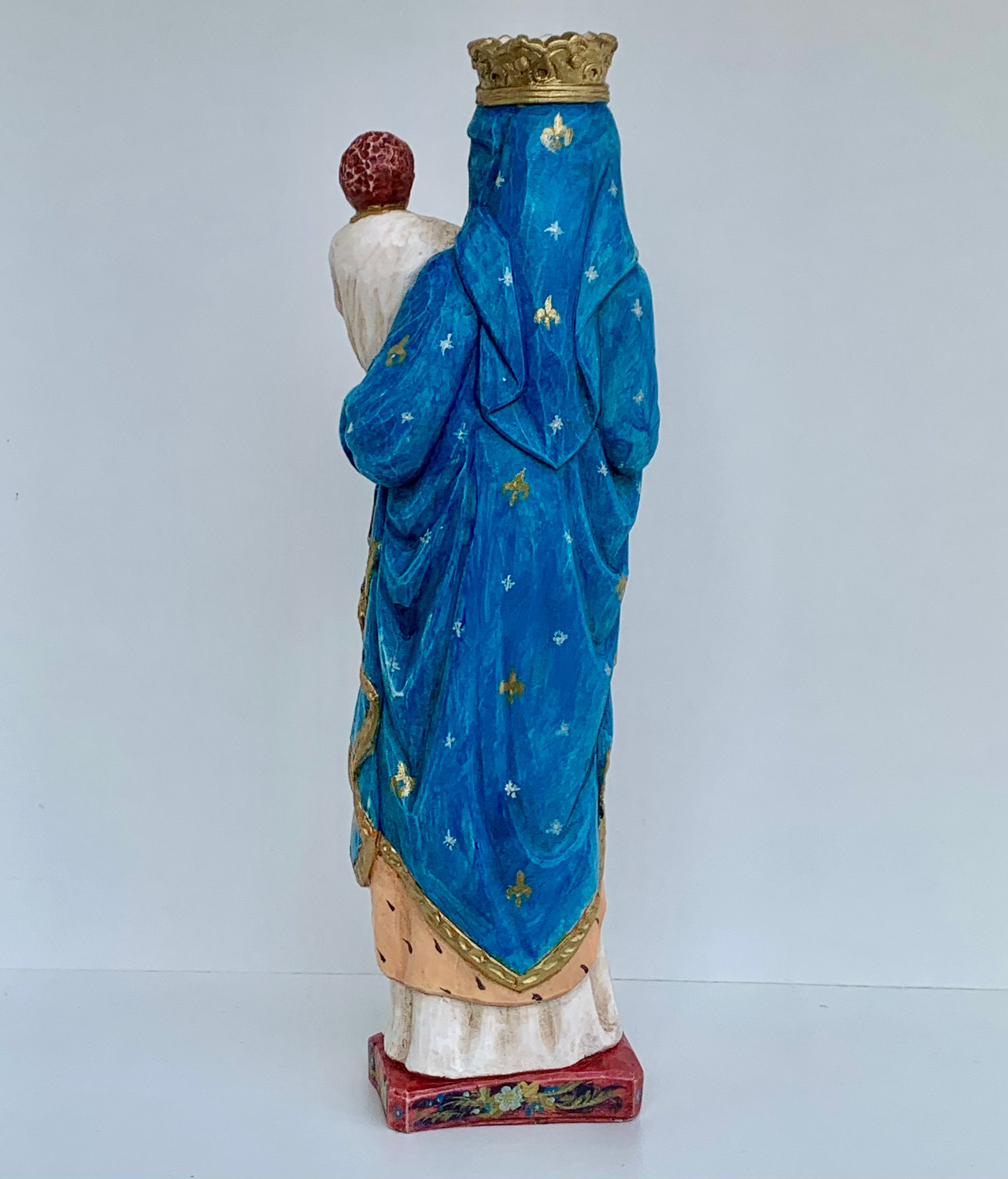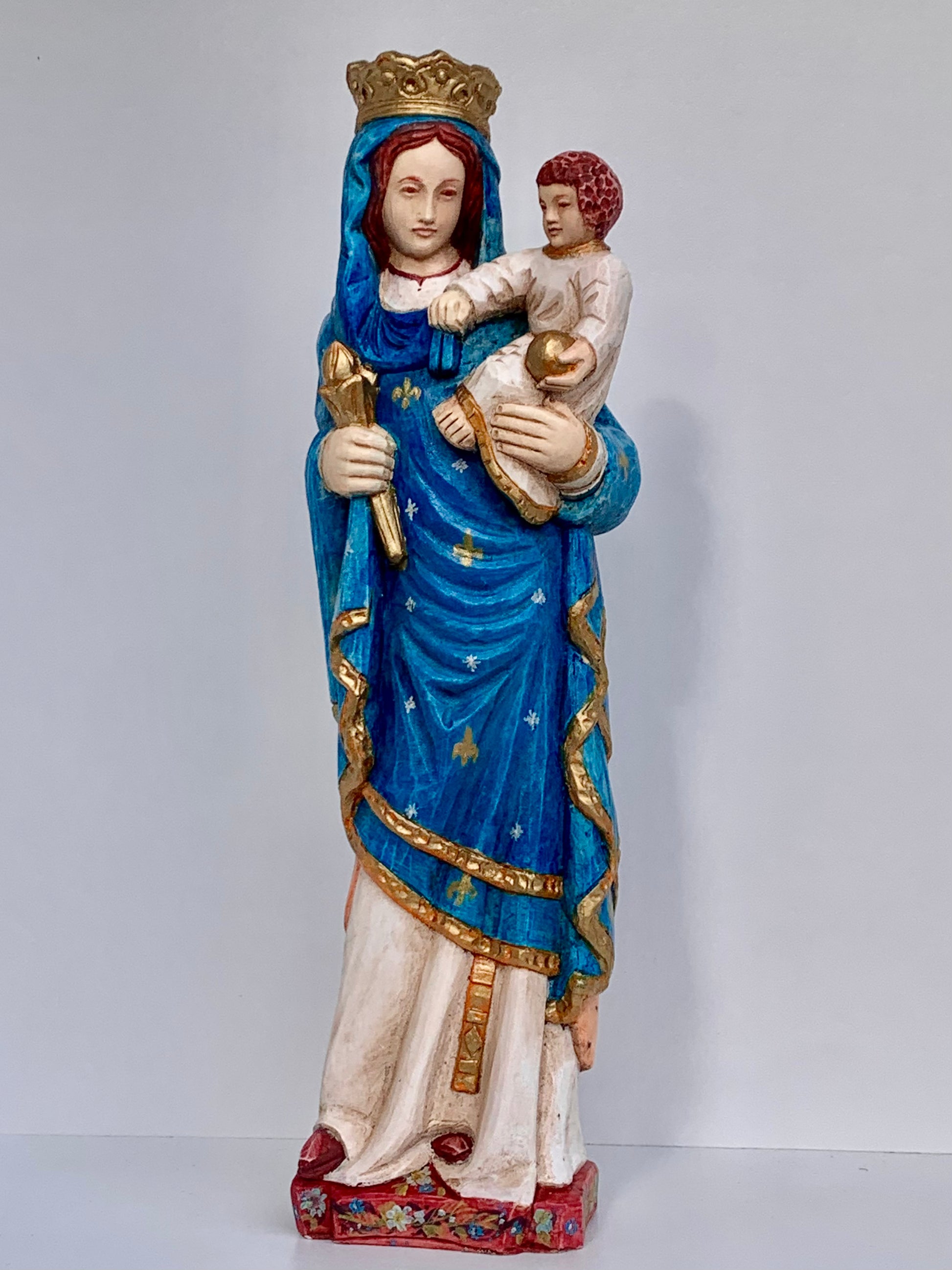 Je vous propose deux versions colorées pour chaque modèle de la madone, une version en polychromie ancienne, et une autre en coloris modernes. Vous pouvez aussi la choisir blanche ou teintée.